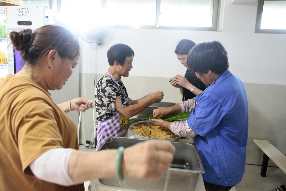 下午,則是千喜包粽子高手們的主場啦!只見一片片香氣四溢的粽葉,在他們的手中上下飛舞,加入晶瑩飽滿的糯米、香噴噴的肉餡,再用細(xì)長的粽繩進(jìn)行纏繞,頃刻間美味可口的粽子就在他們的手上完美誕生。
